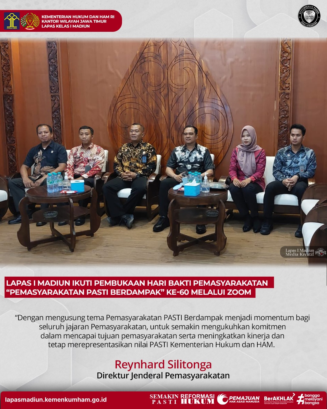 Madiun, Transpos.id – Lapas I Madiun Kanwil Kemenkumham Jatim turut serta dalam pembukaan rangkaian perayaan Hari Bakti Pemasyarakatan ke-60 secara virtual melalui Zoom yang mengusung tema “Pemasyarakatan PASTI Berdampak pada hari Jum’at(08/03) . Kegiatan ini dihadiri oleh Direktur Jenderal Pemasyarakatan, yang diwakili oleh pejabat dari Kementerian Hukum dan Hak Asasi Manusia, serta berbagai pihak terkait lainnya.