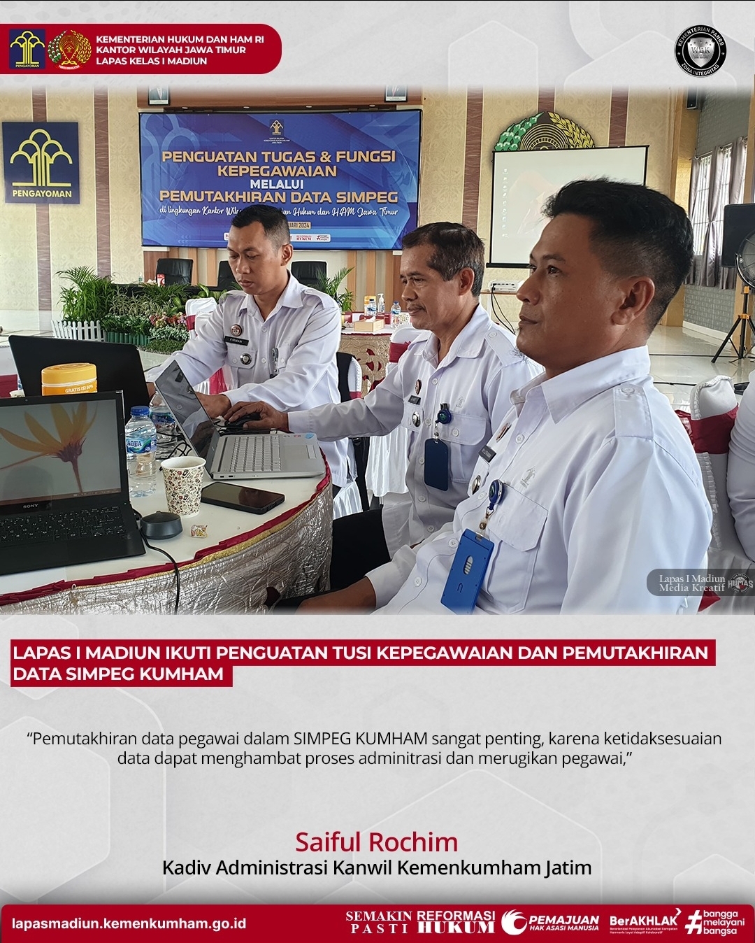 Madiun, Transpos.id– Lapas Kelas I Madiun ikuti penguatan tusi kepegawaian dan pemutakhiran data Simpeg Kumham 2024 yang diadakan oleh Kanwil Kemenkumham Jatim di Aula Adi Sujatno Lapas Pemuda Madiun, Rabu (28/02).