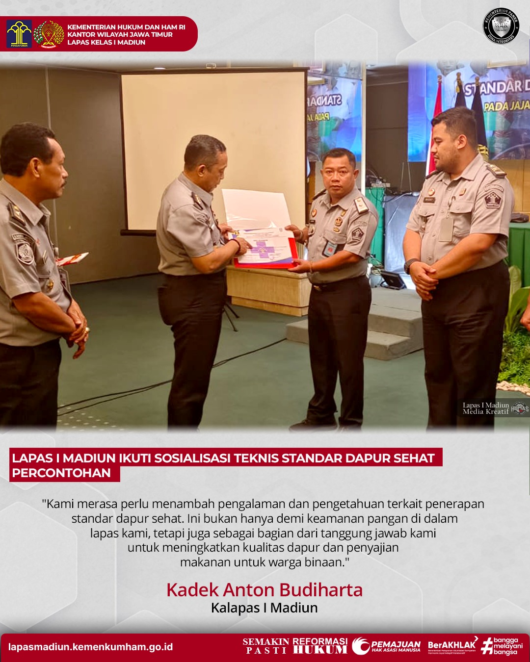 Kepala Lapas I Madiun Kadek Anton, menyampaikan “Kami merasa perlu menambah pengalaman dan pengetahuan terkait penerapan standar dapur sehat. Ini bukan hanya demi keamanan pangan di dalam lapas kami, tetapi juga sebagai bagian dari tanggung jawab kami untuk meningkatkan kualitas dapur dan penyajian makanan untuk warga binaan.”