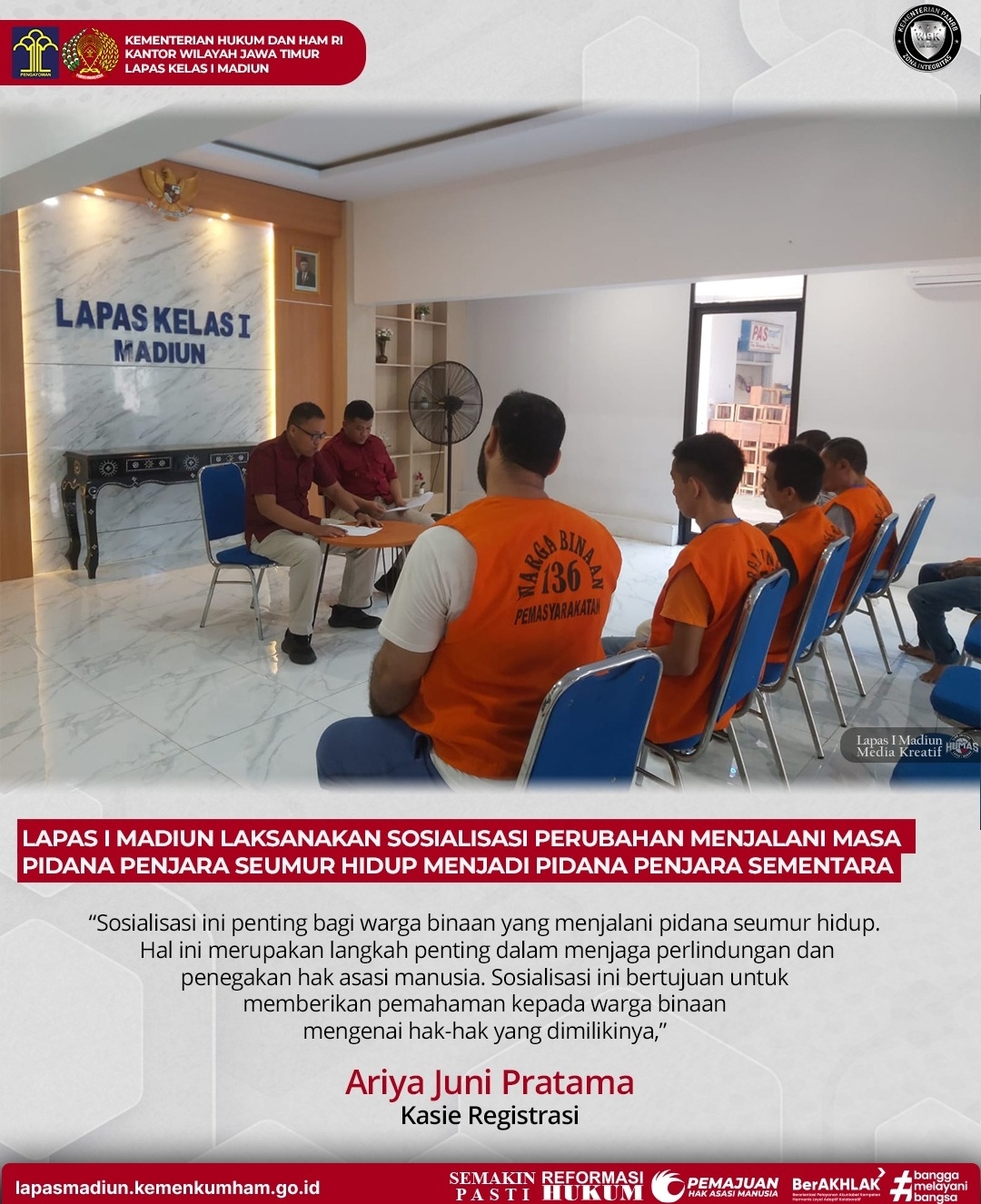 Madiun, Transpos.id- Lembaga Pemasyarakatan Kelas I Madiun Kanwil Kemenkumham Jatim Melaksanakan sosialisasi terkait tata cara pengajuan permohonan perubahan menjalani masa pidana penjara seumur hidup menjadi penjara sementara bagi Warga Binaan Pemasyarakatan Lapas Kelas I Madiun yang menjalani pidana seumur hidup Kamis (29/02).