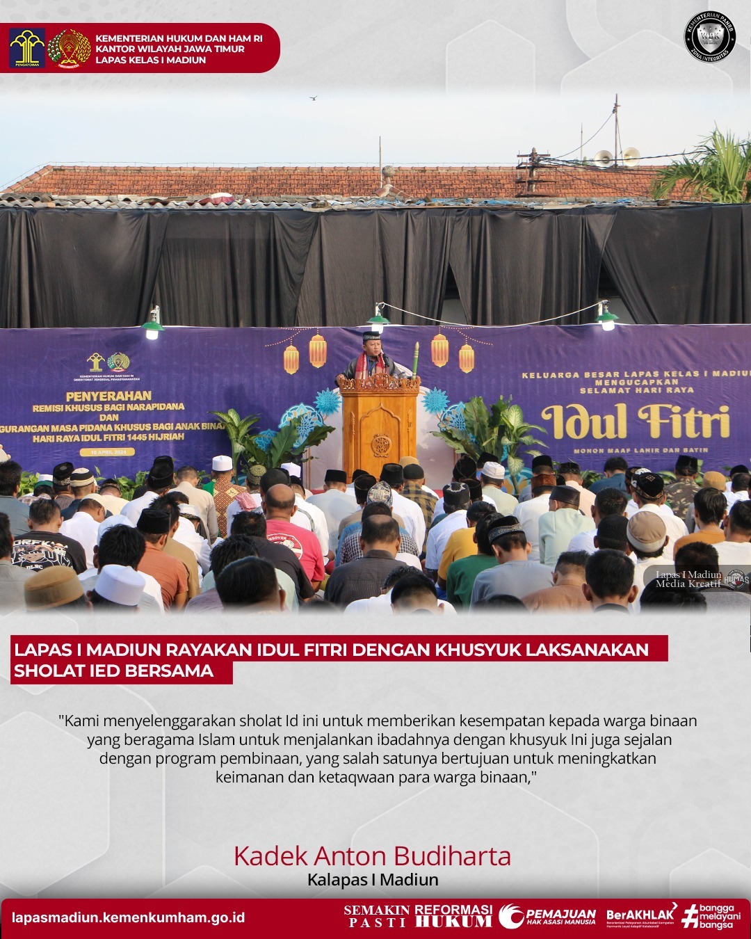Kalapas I Madiun Kadek Anton Budiharta menyampaikan “Kami menyelenggarakan sholat Id ini untuk memberikan kesempatan kepada warga binaan yang beragama Islam untuk menjalankan ibadahnya dengan khusyuk Ini juga sejalan dengan program pembinaan, yang salah satunya bertujuan untuk meningkatkan keimanan dan ketaqwaan para warga binaan,” ujar Kadek Anton
