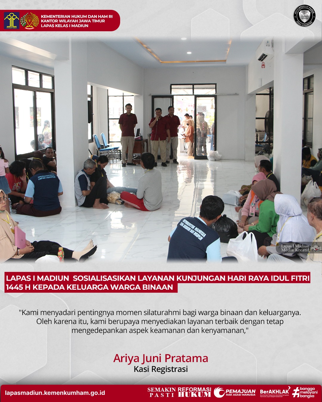 Madiun, Transpos.id- Menjelang perayaan Idul Fitri 1445 H, Lembaga Pemasyarakatan Kelas I Madiun Kanwil Kemenkumham Jatim mengintensifkan sosialisasi terkait layanan kunjungan bagi keluarga warga binaan. Inisiatif ini bertujuan untuk memastikan kelancaran dan kenyamanan selama proses kunjungan di hari yang fitri tersebut, Kamis (04/04).