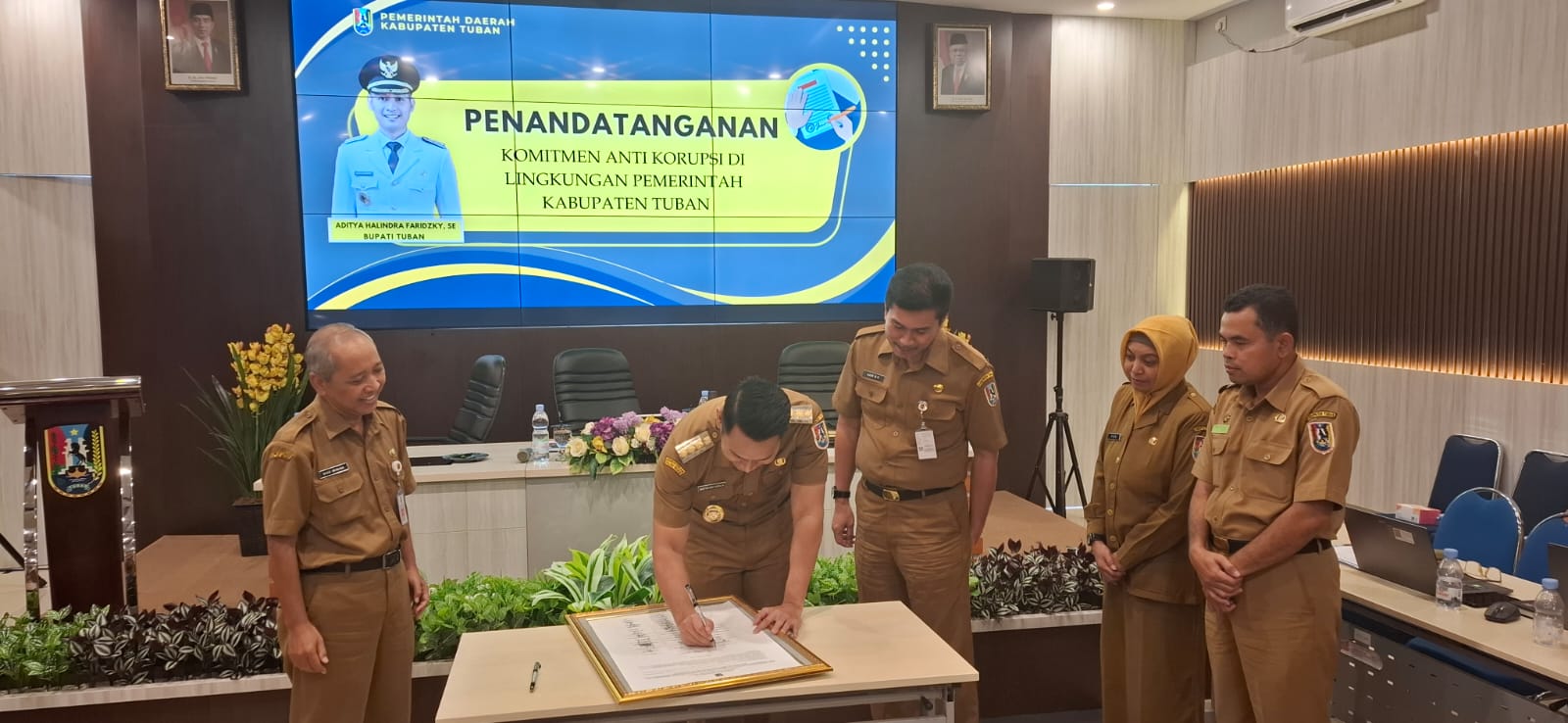 Penandatanganan komitmen bersamaan dengan kegiatan Sosialisasi Hasil Survei Penilaian Integritas (SPI) tahun 2023 dan Penyuluhan Anti Korupsi oleh KPK kepada Pemkab Tuban.