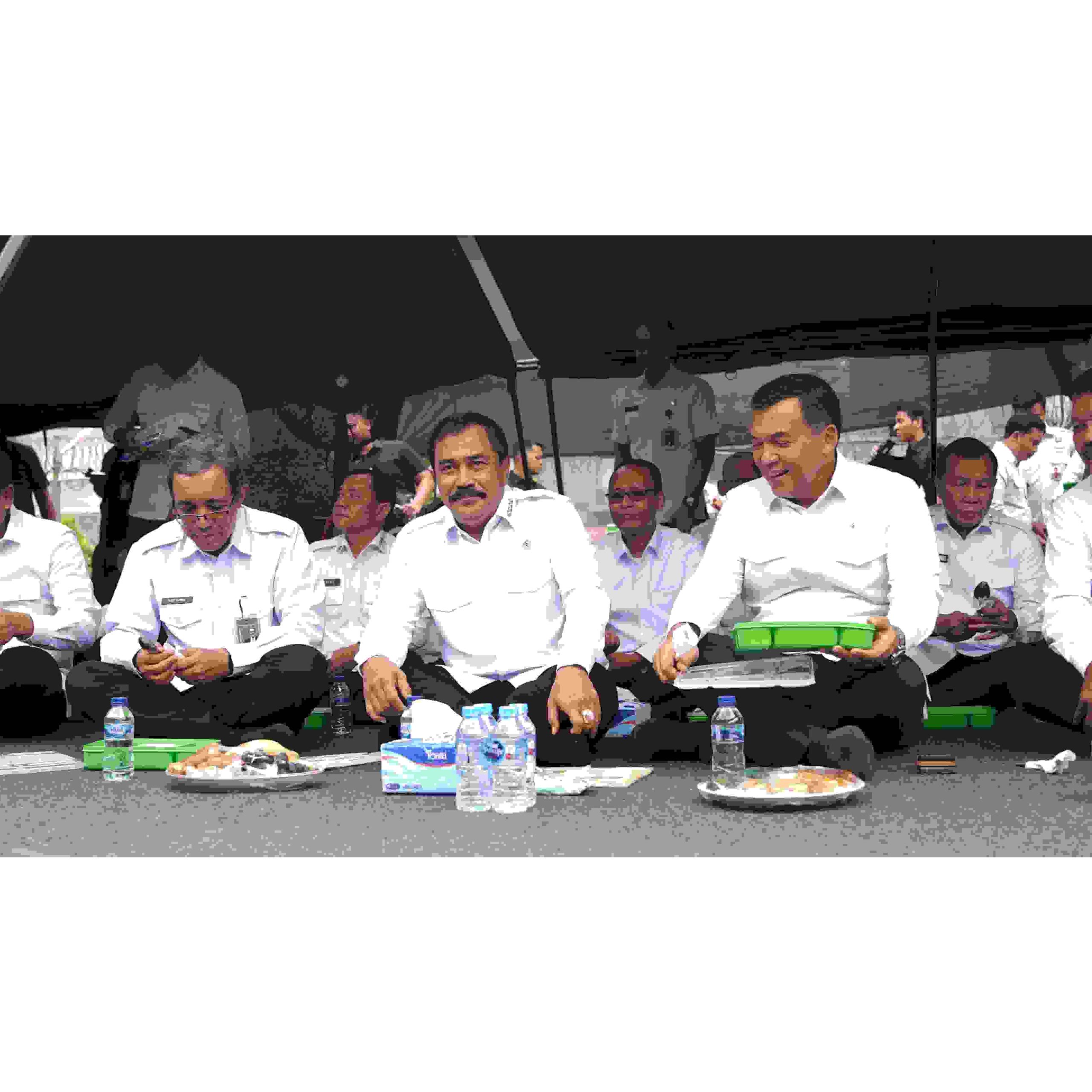 Menteri Imigrasi dan Pemasyarakatan makan siang bersama warga binaan, juga didampingi wakil menteri imigrasi dan Pemasyarakatan, Pimpinan Tinggi dan Ka.UPT Pemasyarakatan. (Hr/Hms)