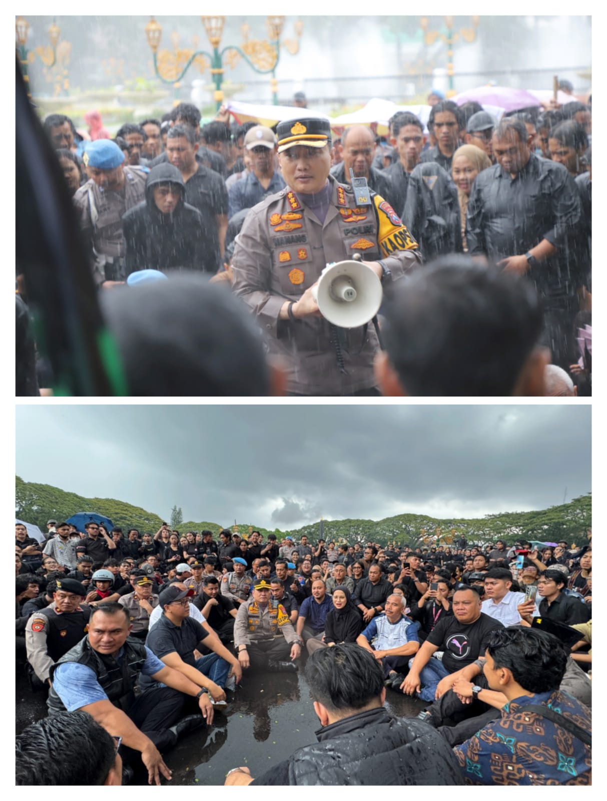 Tak hanya itu, Kombes Pol Nanang juga duduk bersila bersama Ketua DPRD Kota Malang yang basah kuyup di tengah kerumunan massa.