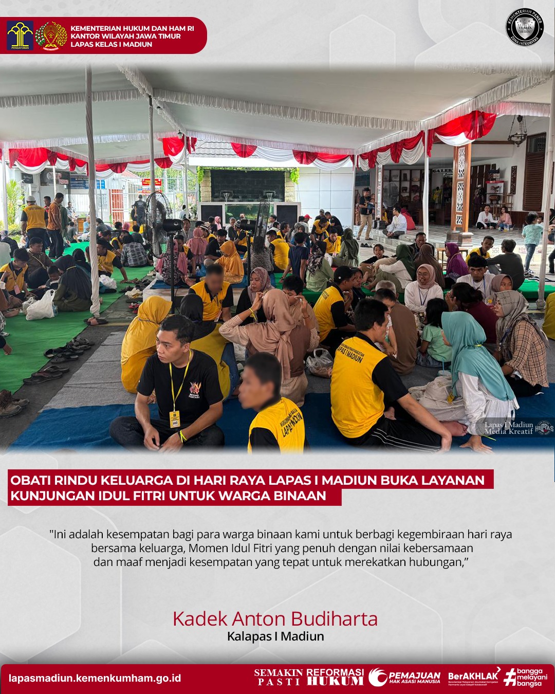 Kalapas I Madiun, Kadek Anton Budiharta menyatakan bahwa layanan kunjungan ini merupakan bagian dari program rehabilitasi sosial dan psikologi bagi para warga binaan. “Ini adalah kesempatan bagi para warga binaan kami untuk berbagi kegembiraan hari raya bersama keluarga, Momen Idul Fitri yang penuh dengan nilai kebersamaan dan maaf menjadi kesempatan yang tepat untuk merekatkan hubungan,” Ujarnya.
