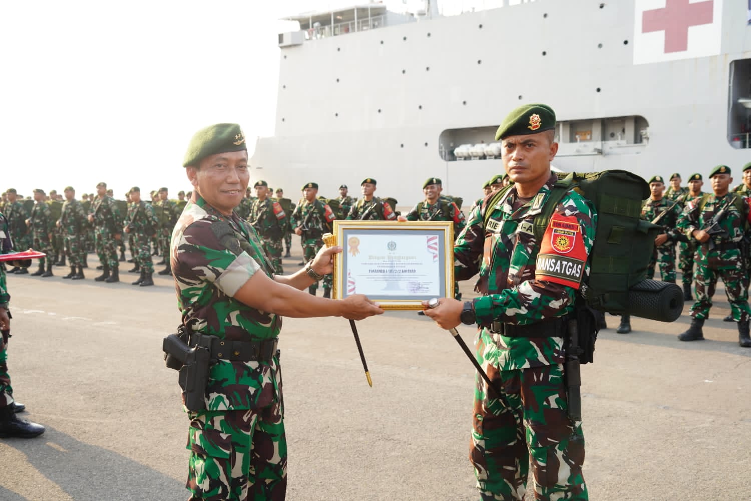 Usai pelaksanaan upacara, Pangdivif 2 Kostrad memberikan penghargaan kepada satuan Yonarmed 1/AY/2/2 Kostrad atas keberhasilannya selama di medan penugasan.(Pen/red)