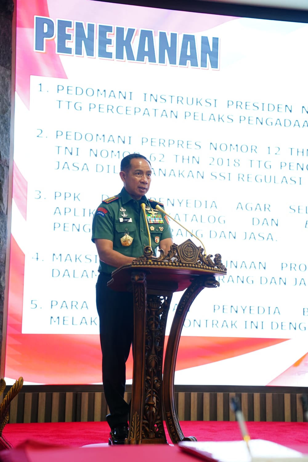 Lebih lanjut Panglima TNI menggaris bawahi agar para Pejabat Pembuat Komitmen (PPK) dan penyedia barang dan jasa dapat melaksanakan kontraknya dengan sebaik-baiknya. “Para penyedia hendaknya mengutamakan kualitas barang dan jasa dan ketepatan waktu serah terima hasil pekerjaan sesuai dengan kontrak yang telah disepakati bersama,” tegas Jenderal TNI Agus Subiyanto.