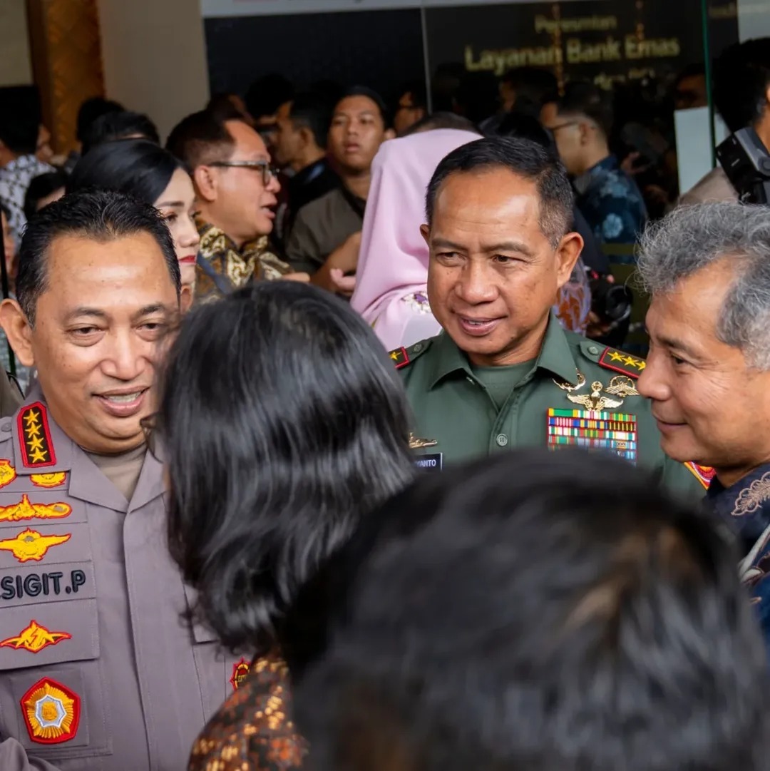 Jakarta – Panglima TNI Jenderal TNI Agus Subiyanto bersama Kapolri Jenderal Pol. Listyo Sigit Prabowo menghadiri peresmian Layanan Bank Emas Pegadaian dan Bank Syariah Indonesia oleh Presiden RI Prabowo Subianto, bertempat di The Gade Tower, Senen, Jakarta Pusat, Rabu (26/02/2025).