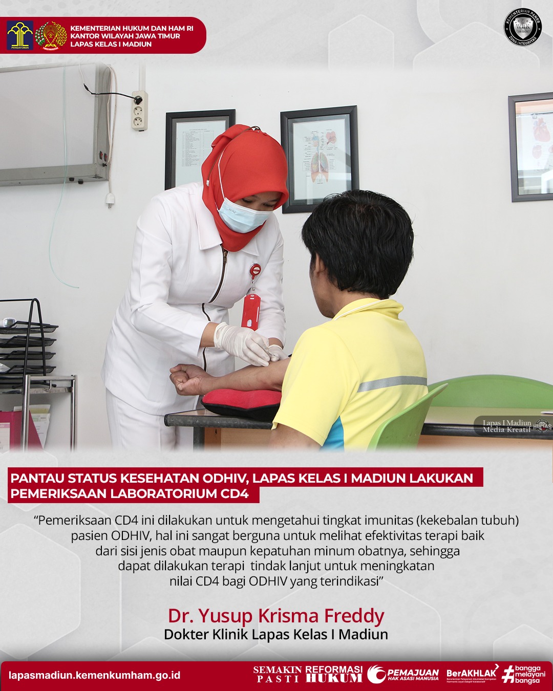 “Pemeriksaan CD4 ini dilakukan untuk mengetahui tingkat imunitas (kekebalan tubuh) pasien ODHIV, hal ini sangat berguna untuk melihat efektivitas terapi baik dari sisi jenis obat maupun kepatuhan minum obatnya, sehingga dapat dilakukan terapi tindak lanjut untuk meningkatan nilai CD4 bagi ODHIV yang terindikasi” ujar Dr. Yusup Krisma Freddy selaku Dokter Klinik Lapas Kelas I Madiun.