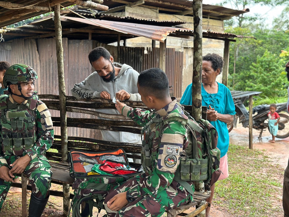 Boven Digoel – Satgas Pamtas RI-PNG Yonif 126/Kalacakti mendukung kesejahteraan masyarakat di wilayah perbatasan melalui penyelenggaraan pelayanan kesehatan gratis bagi warga Kampung Kanggewot, Distrik Waropko, Kabupaten Boven Digoel, Papua Selatan, Jumat (5/9/2025).
