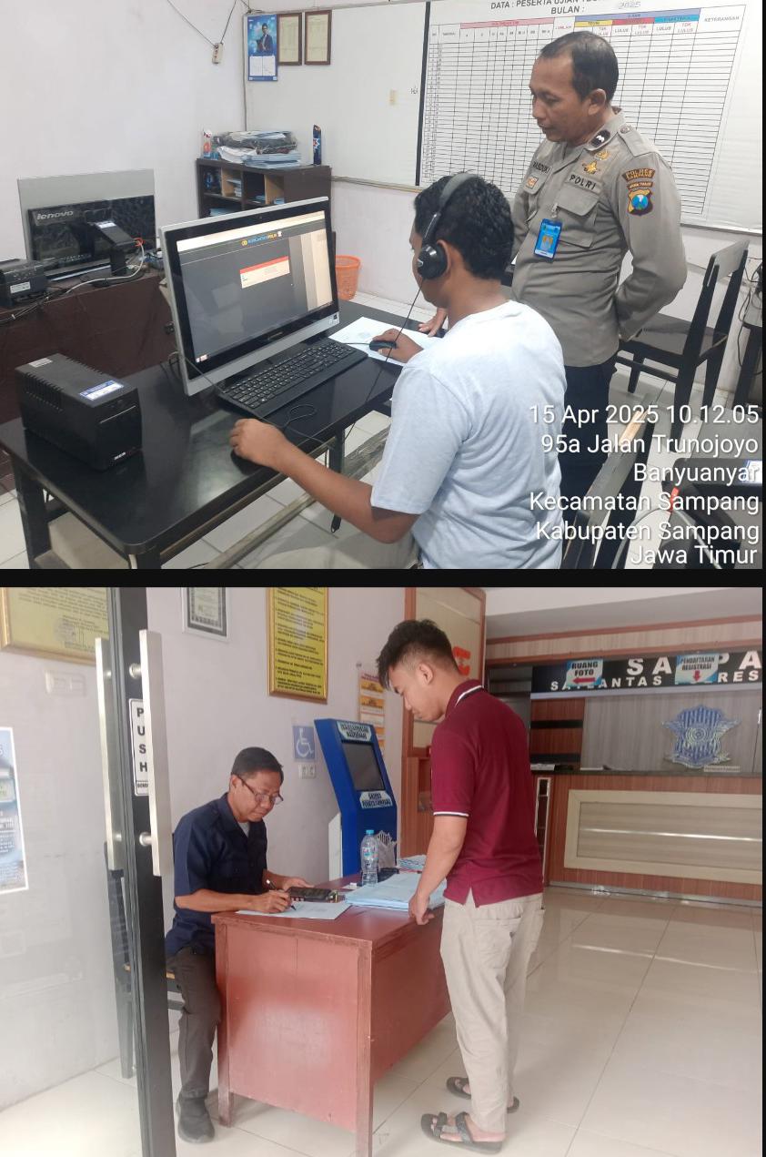 Giat tersebut Kantor Satpas Satlantas Polres Sampang di Jalan Trunojoyo No 95 Kota Sampang, Madura Jawa Timur, menerima persyaratan pemohon SIM baru maupun perpanjangan dan memberikan blangko formulir pengisian pemohon SIM. Juga petugas Satlantas Polres Sampang membimbing pengisian formulir sesuai contoh yang telah disediakan, kemudian mengarahkan pemohon SIM untuk identifikasi maupun uji teori dan uji praktek.