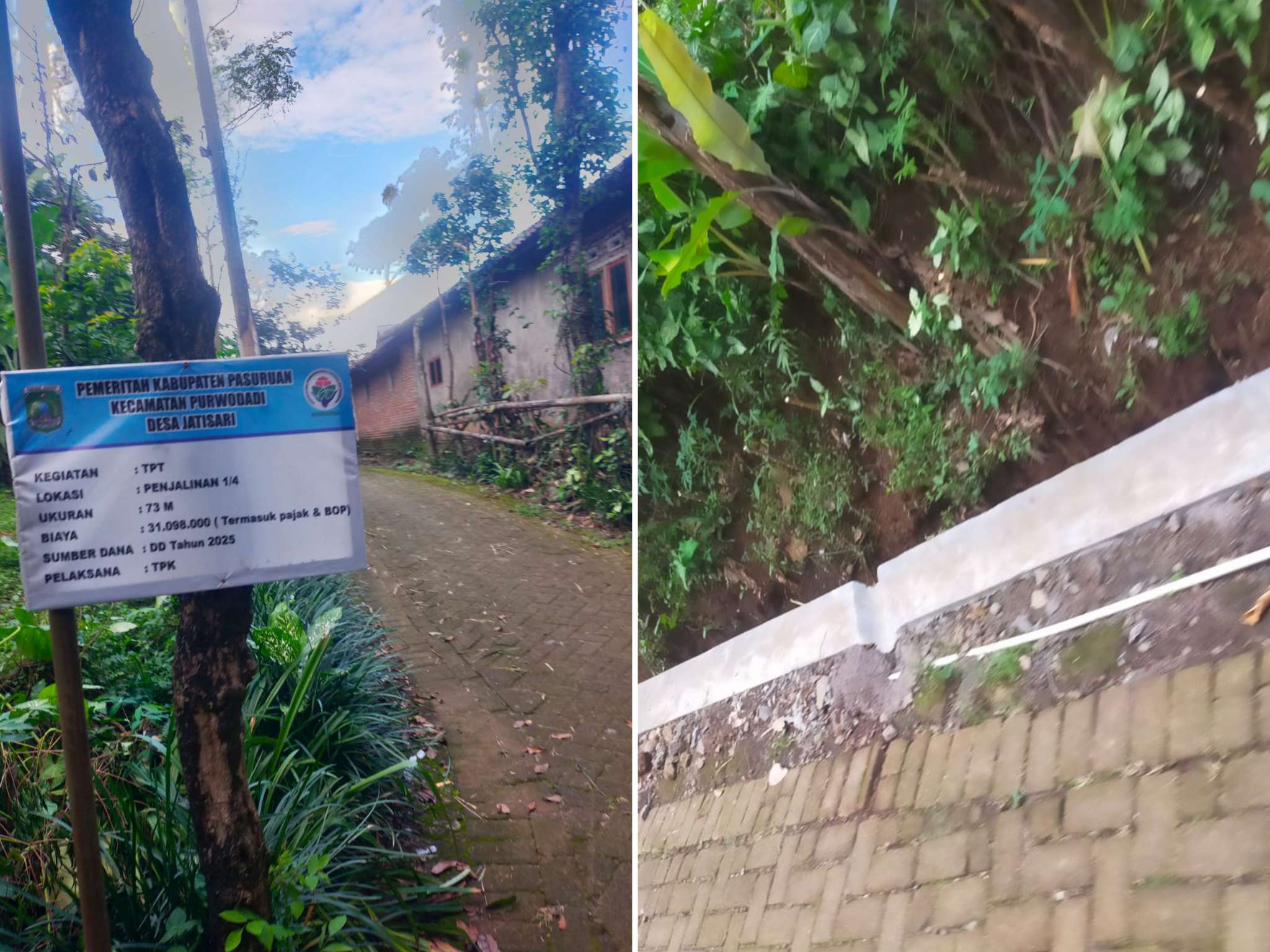 Pasuruan – Pemerintah Desa Jatisari, Kecamatan Purwodadi, Kabupaten Pasuruan merealisasikan pembangunan Tembok Penahan Tanah dan drainase dengan volume 75 Meter.