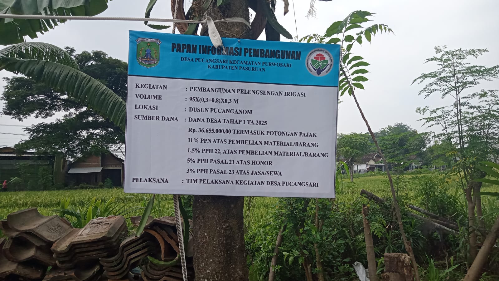 Pasuruan – Pemdes Pucangsari manfaatkan dana Desa tahap 1/pertama, untuk membangun plengsengan Irigasi Pelaksanaan pembangunan Desa sub bidang pekerjaan umum dan penataan ruang saat ini pembangunan irigasi yang berlokasi Dusun pucanganom RT 08, RW 10, Desa Pucangsari Kecamatan Purwosari Kabupaten Pasuruan Jatim, pekerjaan Sudah seratus 100%persen selesai, pada bulan juni tanggal 2/ tahun 2025 oleh pelaksana Kegiatan anggaran Pemerintah Desa Pucangsari Pembangunan tersebut menggunakan sumber dana yang berasal dari APBN/ Dana Desa (DD) tahap satu tahun anggaran 2025 sebesar 36.655.000.00 termasuk Potongan pajak 11% PPN pembelanjaan Matrial/barang 1,5% PPH 22, Atas pembelian/Matrial/barang 5% PPH pasal 21 atas Honor 3% PPH pasal 23 atas jasa/Sewa , pelaksana kegiatan, Tim TPK desa Pucangsari, dengan panjang 95X( 0,3+0,3)X0,3 Meter Sumber Dana Desa tahap pertama 2025. Minggu 08/6/2025.