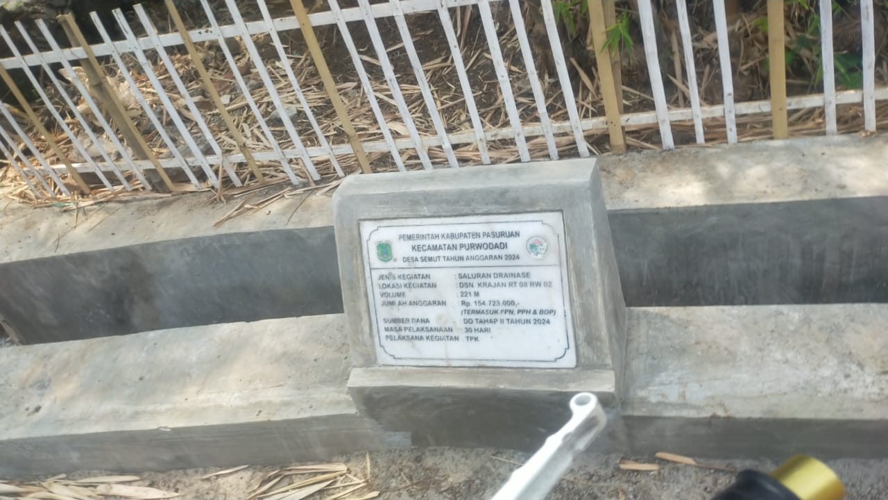 Tim Pelaksana Kegiatan (TPK) Desa semut meraih kesuksesan dalam menyelesaikan proyek normalisasi drainase pembuang di Dusun krajan RT 08 RW. 02 Proyek yang melibatkan upaya peningkatan sistem drainase tersebut berhasil diselesaikan dengan volume mencapai 221 Meter .tahap 2 dua. Tahun anggaran 2024. nilai pagu anggaran sebesar Rp 154,723,000.