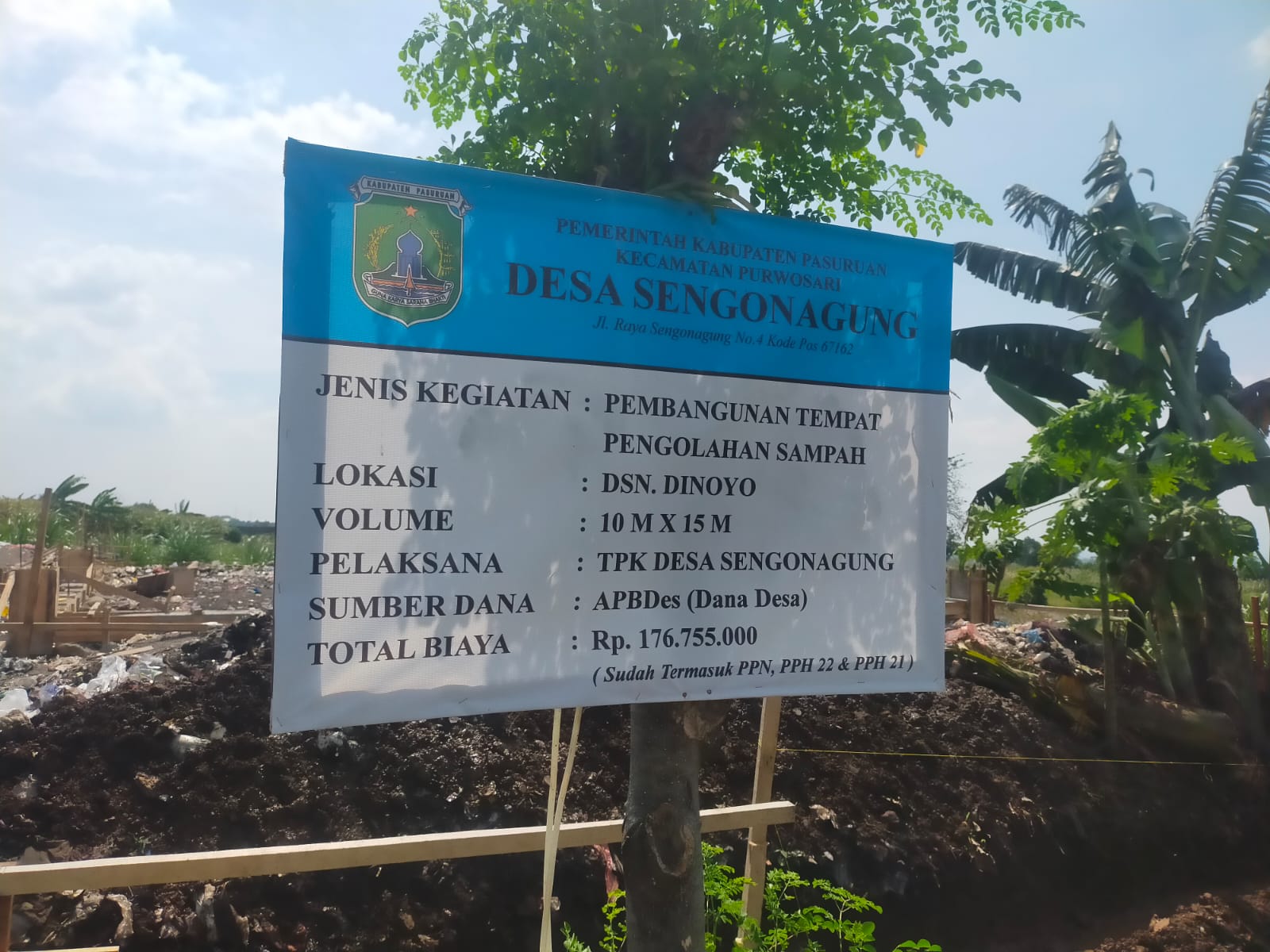Pasuruan – Pemerintah Desa Sengonagung, Kecamatan Purwosari, Kabupaten Pasuruan melakukan proses pembangunan sarana Tempat Pembuangan Sampah (TPS ) di Dusun Dinoyo, Volume Panjang 10 meter X 15 meter, Sumber Dana APBDesa (Dana desa’) Total biaya Rp 176,755,000 (sudah termasuk PPN PPH 22,& PPH 21) pelaksana TPK Sengonagung.
