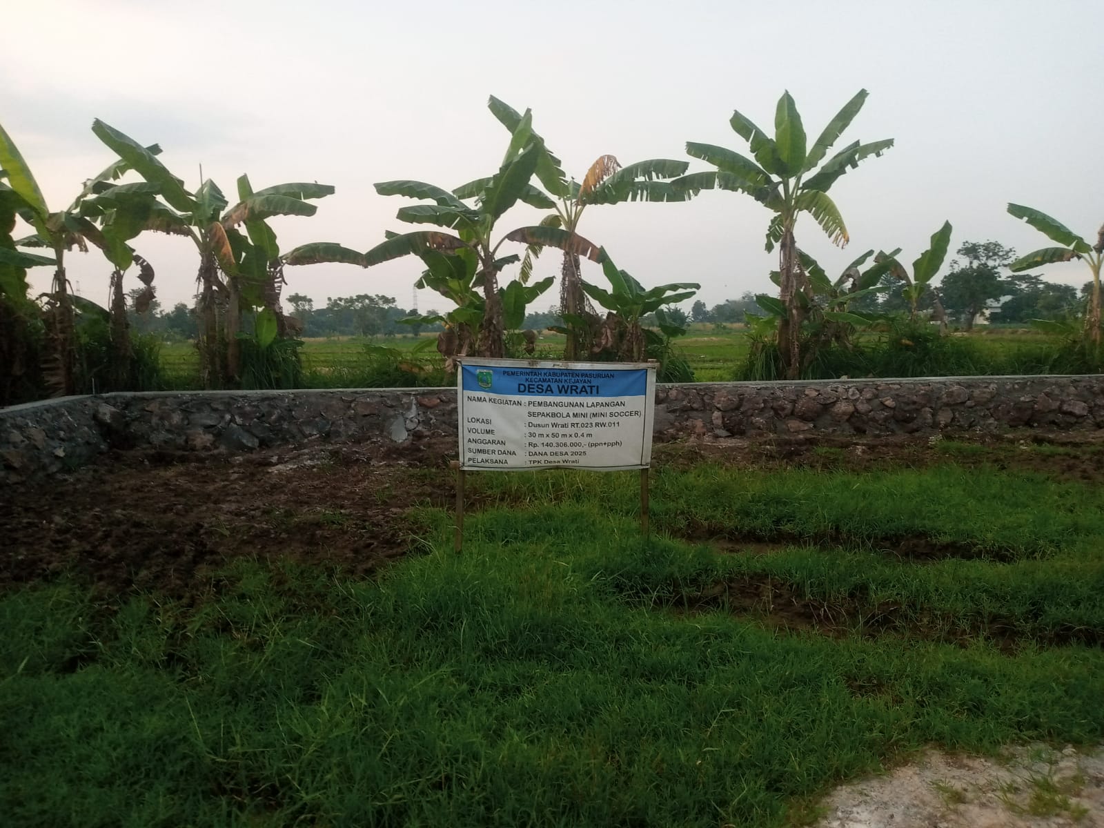 Pasuruan – Pemerintah Desa Wrati, Kecamatan Kejayan, Kabupaten Pasuruan merealisasikan Dana Desa tahap pertama Tahun Anggaran 2025 dengan membangun lapangan sepak bola dengan volume 30 meter x 50 meter, x 0,4 meter.