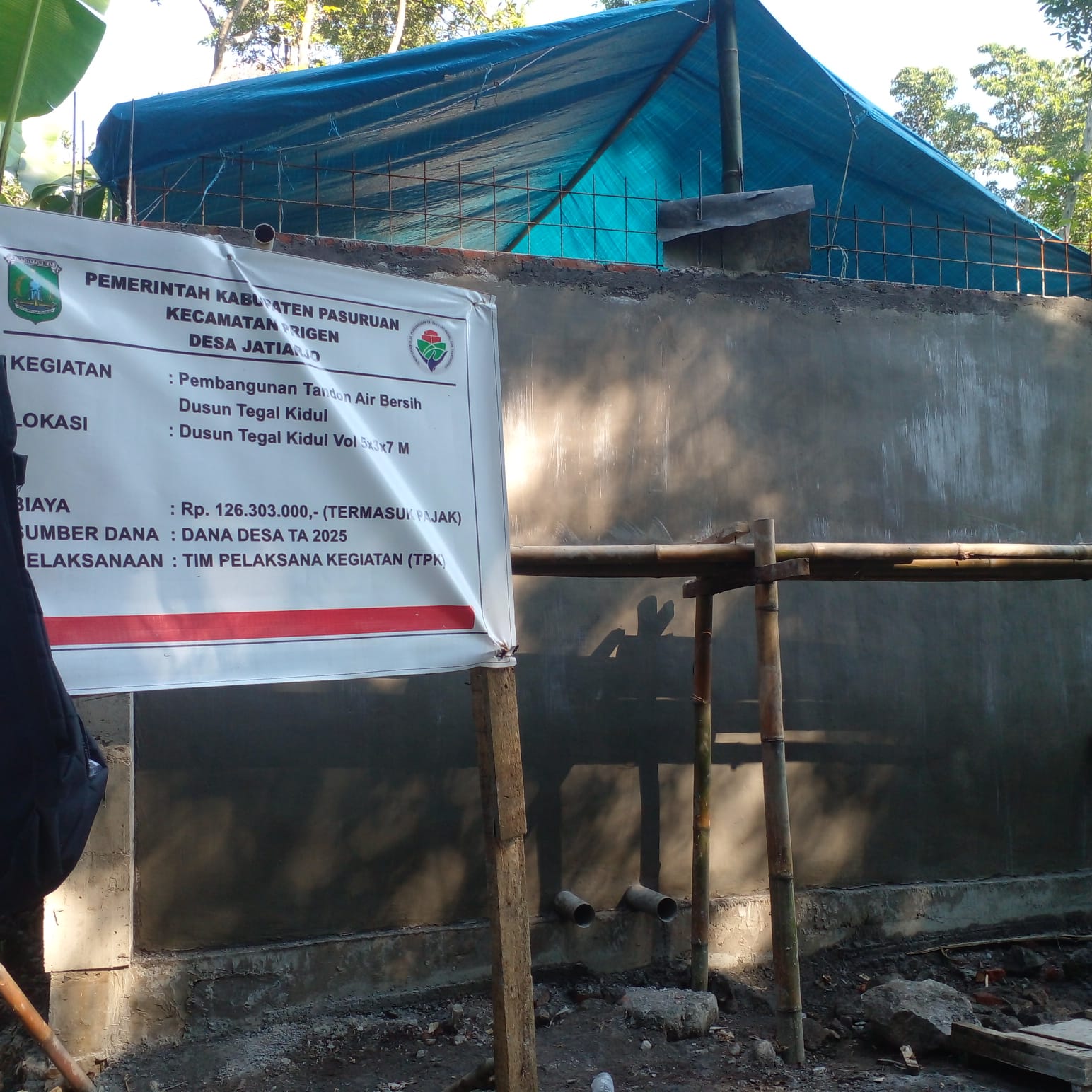 Pasuruan – Pembangunan Infrastruktur Tandon Air Bersih di Dusun Tegal, Desa Jatiarjo, Kecamatan Prigen, Kabupaten Pasuruan. Menindaklanjuti Peraturan Menteri Desa, Pembangunan Daerah Tertinggal, dan Transmigrasi (Permendes PDTT) Nomor 2 Tahun 2024 tentang Petunjuk Operasional atas Fokus Penggunaan Dana Desa Tahun 2025, khususnya terkait penguatan desa yang adaptif terhadap perubahan iklim, Minggu (22 /6/2025).