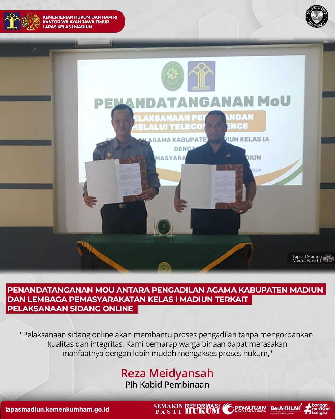 Sementara itu, Kepala Lembaga Pemasyarakatan Kelas I Madiun melalui Plh Kabid Pembinaan Reza Meidyansah, menekankan pentingnya kerjasama ini untuk menciptakan sistem peradilan yang lebih modern dan efisien. “Pelaksanaan sidang online akan membantu proses pengadilan tanpa mengorbankan kualitas dan integritas. Kami berharap warga binaan dapat merasakan manfaatnya dengan lebih mudah mengakses proses hukum,” kata Reza.