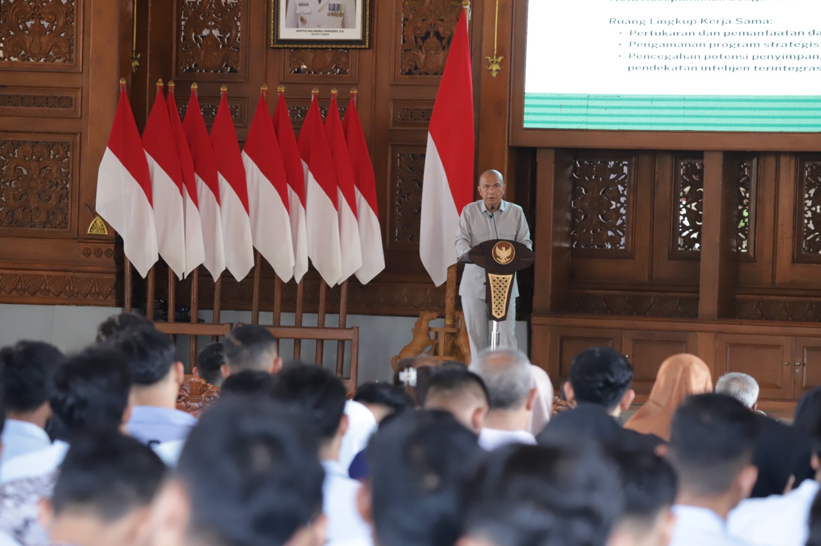 Forum ini dihadiri Jaksa Agung Muda Intelejen Kejaksaan Agung RI, Wakil Ketua BGN Bidang Operasional, Bupati Tuban bersama Wabup dan Forkopimda Tuban, Bupati Bojonegoro, Kepala Kejaksaan Negeri Kabupaten/Kota sekitar, Sekda Tuban, serta pimpinan OPD terkait, Rabu (01/04/2026). Berlokasi di Pendopo Krido Manunggal Tuban, seluruh perwakilan SPPG di Kabupaten Tuban dan Bojonegoro mengikuti sosialisasi pengawasan SPPG hingga tuntas.