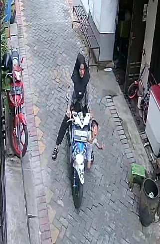 Pelaku terlihat jelas, seorang ibu-ibu menggunakan kerudung hitam dan menggunakan kaos lengan panjang motif bunga celana hitam, menggunakan motor metik Honda Beat Nopol S 5882 PS.