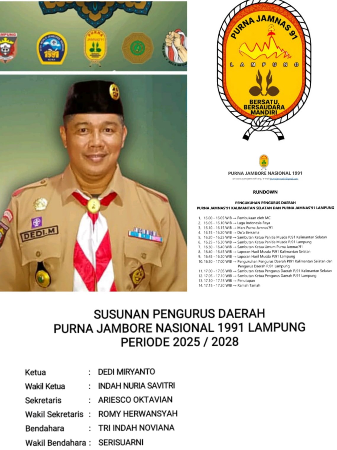 Dengan semangat kebersamaan, diharapkan sinergi antara seluruh organisasi pjn91 se indonesia solid dan membantu pemerintah daerah dapat terjalin baik dan bertambah maju, tutup sambutan ketua terpilih dan juga purna jambore dunia ke.17 di Korea selatan :Dedi miryanto,SE