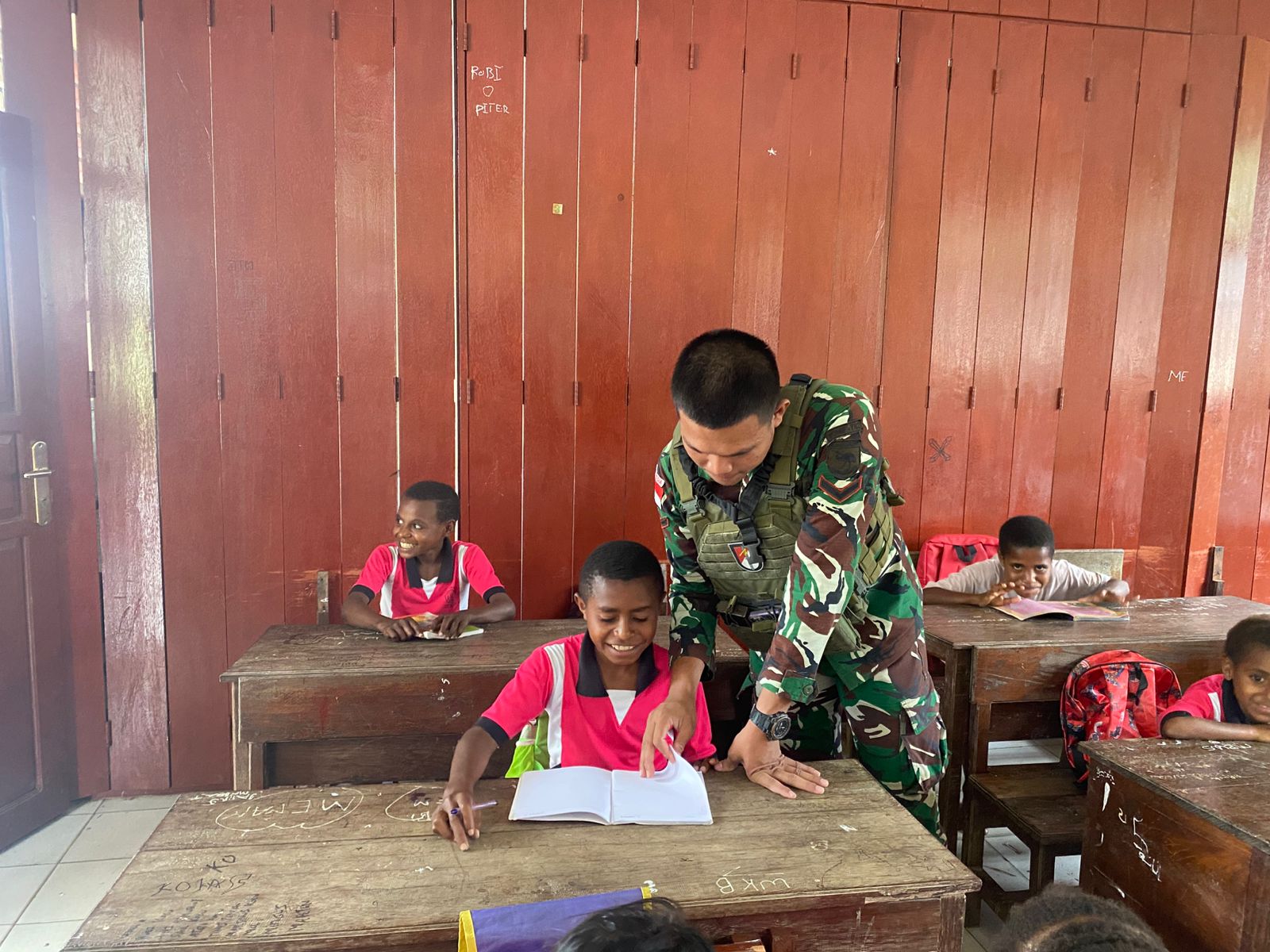 MAYBRAT, transpos.id – Tanamkan nilai-nilai Pancasila kepada anak-anak di wilayah penugasan, Satgas Pamtas RI-PNG Kewilayahan Papua Barat Daya Yonif 762/VYS Pos Kokas memberikan wawasan kebangsaan kepada siswa-siswi SD YPPK Efata Kocuwer, Kampung Kokas, Distrik Aifat, Kab.Maybrat. Sabtu (21/09/2024).