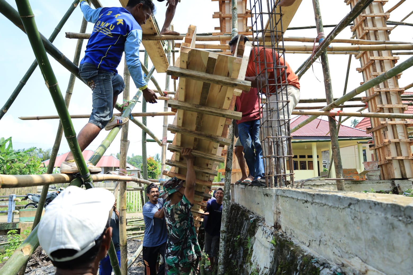 Kegiatan gotong royong tersebut dilakukan dengan penuh semangat. Anggota Satgas bersama masyarakat tampak kompak mengangkat papan mal yang sudah disiapkan, kemudian memasangnya di setiap tiang yang akan dicor. Pekerjaan ini merupakan salah satu tahapan penting dalam pembangunan masjid yang menjadi sasaran fisik program TMMD di Desa Lifofa.