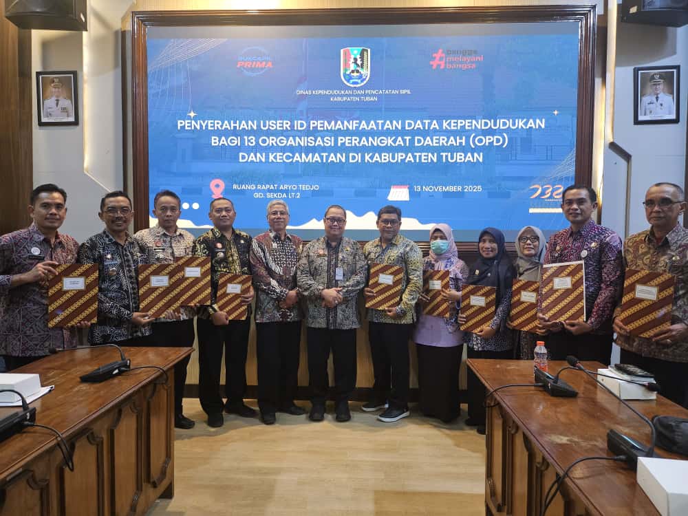 Tuban – Upaya memperkuat layanan publik di Kabupaten Tuban memasuki babak baru. Dinas Kependudukan dan Pencatatan Sipil Kabupaten Tuban resmi menyerahkan User ID Pemanfaatan Data Kependudukan kepada 13 OPD dan kecamatan dalam agenda yang digelar Kamis (13/11) di Ruang Rapat Aryo Tejo Sekretariat Daerah Kabupaten Tuban. Langkah ini membuka akses langsung bagi instansi untuk menggunakan data kependudukan terverifikasi sebagai dasar layanan.