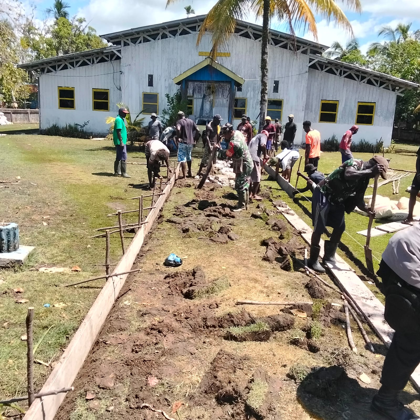 Timika, transpos.id – Wujud kerja nyata Babinsa Koramil 1710-01/Kokonao Serka Hendrik F Renyaan bersama warga masyarakat binaan tampak saat kegiatan gotong royong bersama masyarakat melaksanakan pengecoran jalan menuju sarana ibadah Gereja Katolik Kokonao di Kp. Kokonao, Distrik Mimika Barat, Kah. Mimika, Kamis (05/02/2026).