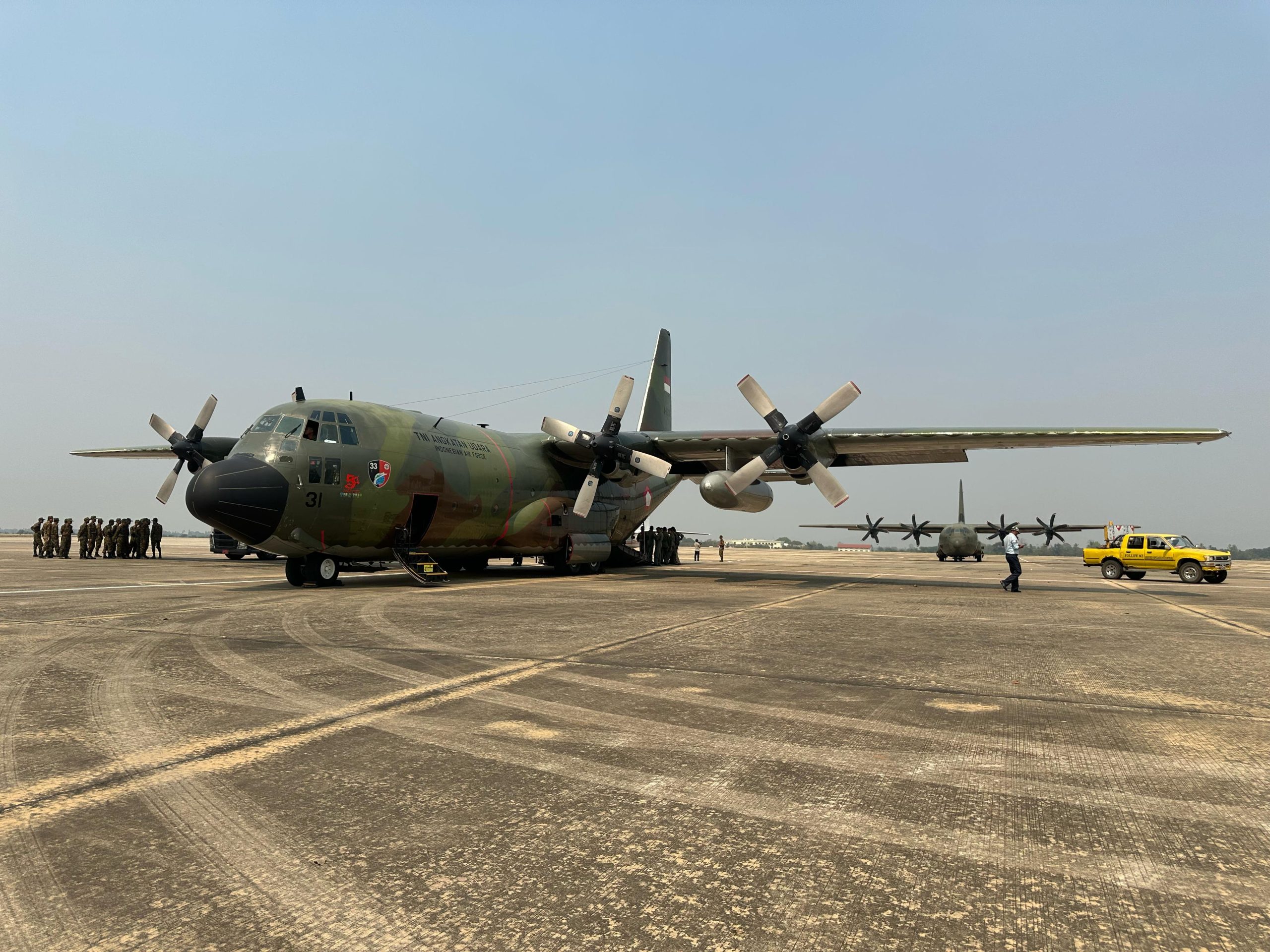 Myanmar – Pesawat TNI AU Hercules C-130 dari Skadron Udara 33 Lanud Sultan Hasanuddin, yang membawa bantuan kemanusiaan dari pemerintah Indonesia seberat 10.446 kg untuk korban gempa bumi di Myanmar mendarat di Bandara Nay Pyi Taw Myanmar, Rabu (2/4/2025).