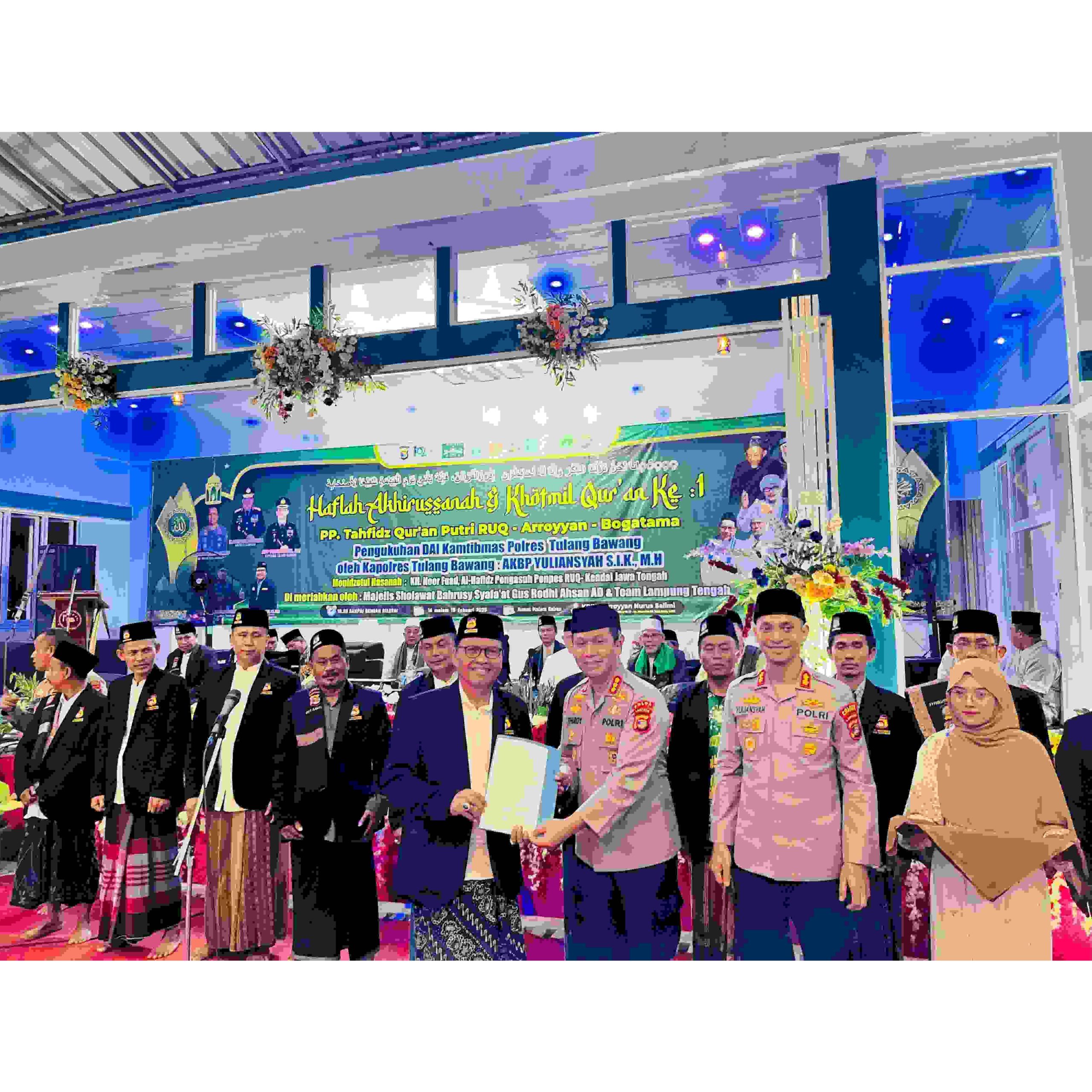 LAMPUNG, Transpos.id. – Polda Lampung melalui Direktorat Binmas mengukuhkan para Da’i Kamtibmas dalam acara Haflah Akhirussanah & Khotmil Qur’an Ke-1 yang digelar di Pondok Pesantren Roudhotu ‘Usyaqil Qur’an, Kecamatan Penawartama, Kabupaten Tulang Bawang, Jumat (14/2/2025) malam.