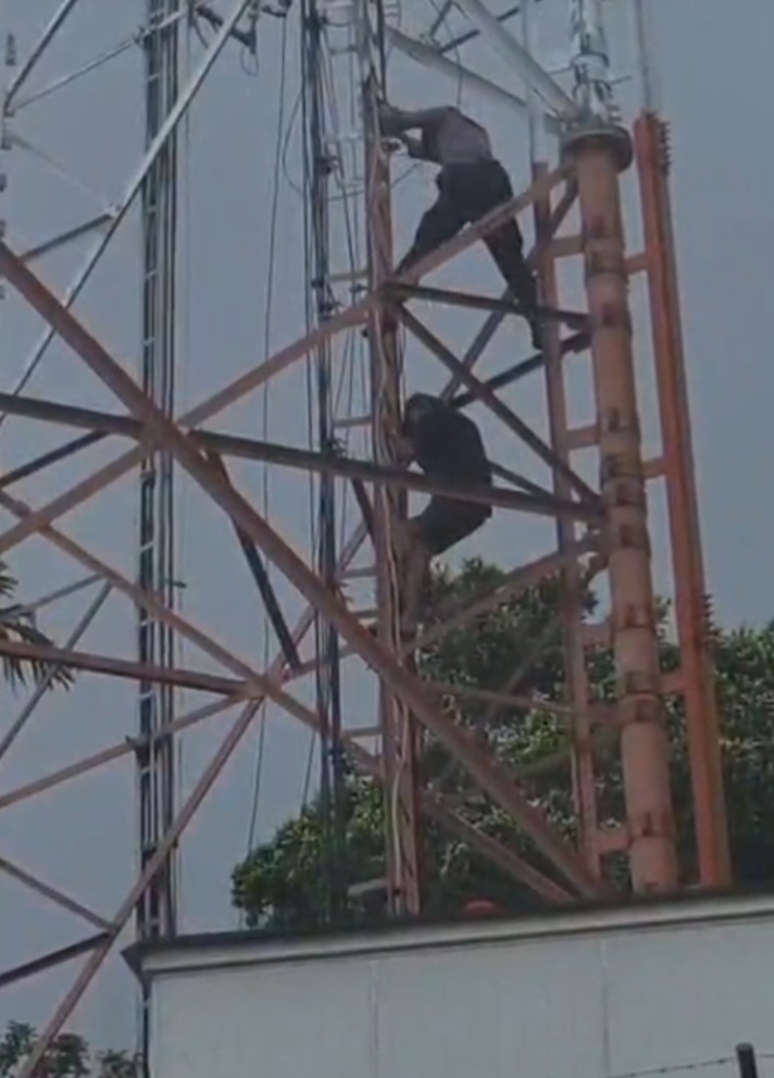Salah satu pelaku yang masih berada di atas tower menolak turun, hingga akhirnya petugas terpaksa memanjat tower untuk mengamankan pelaku.