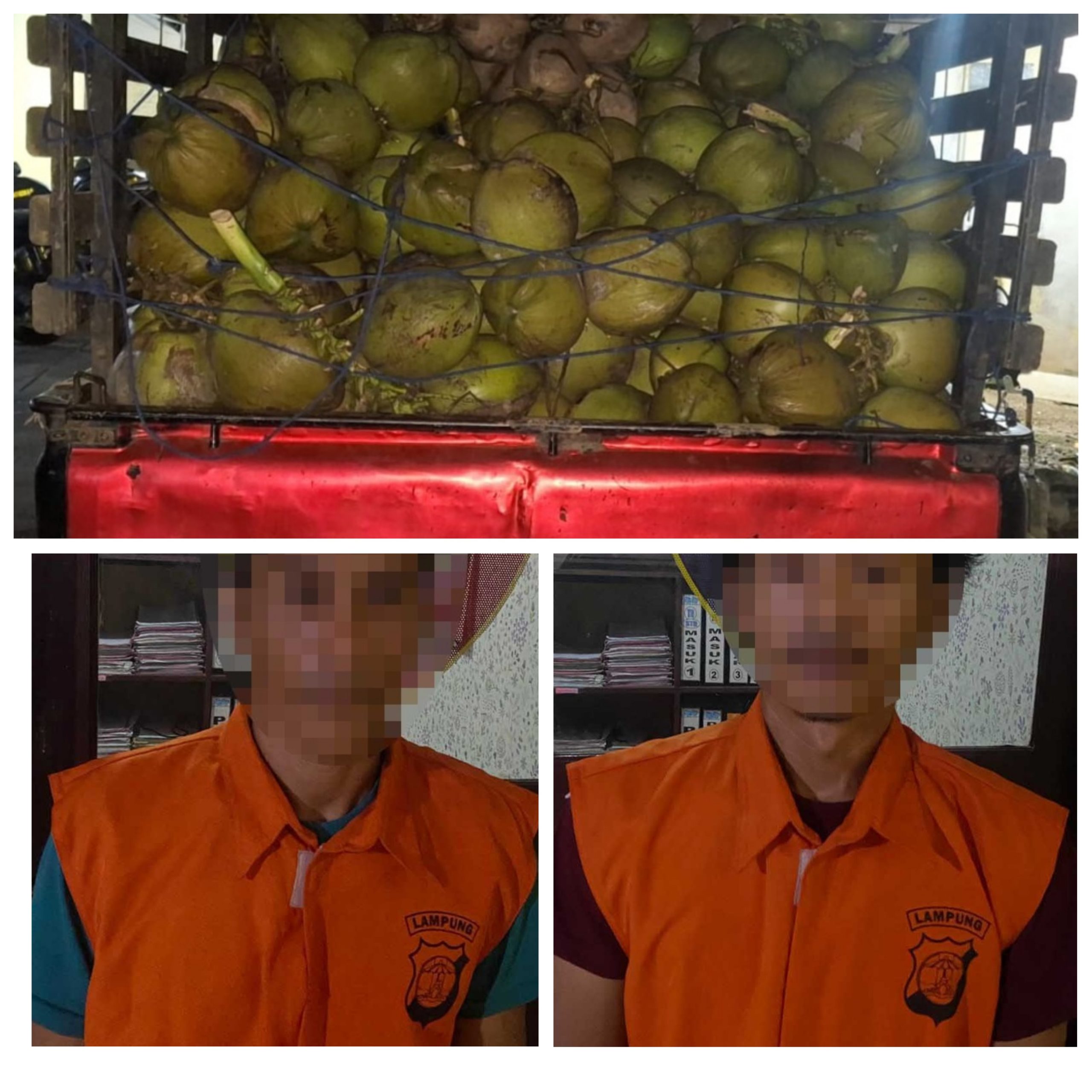 “Barang bukti yang berhasil diamankan dari para pelaku berupa satu unit mobil pick up merk Mitsubishi L300 warna hitam dengan nomor polisi BE 8231 EY atas nama Dewo, sebanyak 500 butir buah kelapa hasil curian, satu bilah golok, serta satu buah senter” pungkas AKP Rudi
