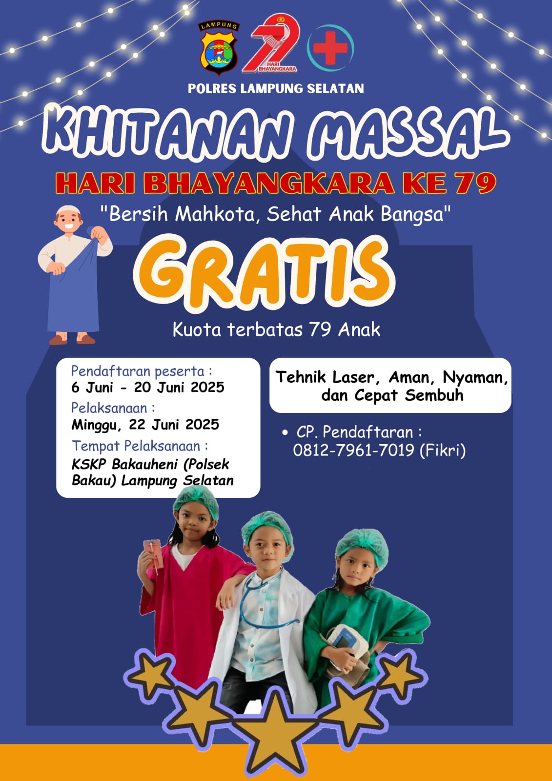 Pendaftaran peserta dibuka mulai 6 hingga 20 Juni 2025 dengan kuota terbatas hanya untuk 79 anak. Kegiatan ini mengusung tema “Bersih Mahkota, Sehat Anak Bangsa” dan menggunakan teknik laser yang dinilai lebih aman, nyaman, dan cepat sembuh.