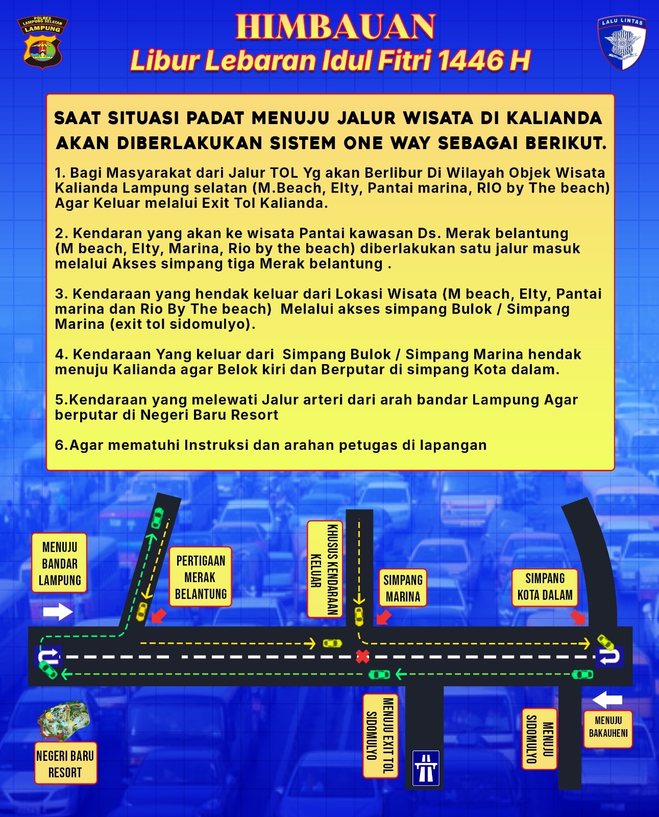 Kasat Lantas Polres Lampung Selatan, AKP R Manggala Agung SM , menjelaskan, “Sistem one way ini diberlakukan mulai dari jalur Tol menuju Objek Wisata Kalianda, termasuk M Beach, Elty, Pantai Marina, dan RIO By The Beach.”