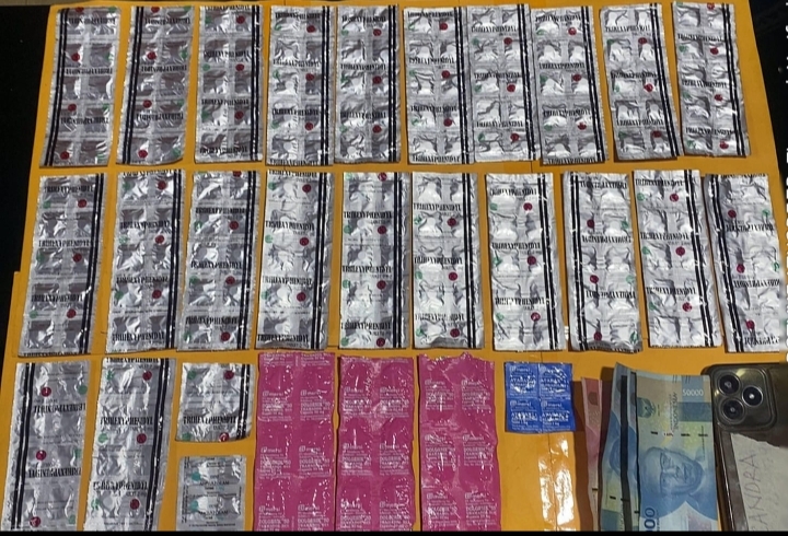 Dari tangan pelaku, petugas menyita ratusan butir obat keras berbahaya (Okerbaya) daftar G, di antaranya Trihexyphenidyl, Dolgesik, Alprazolam, dan Atarax.