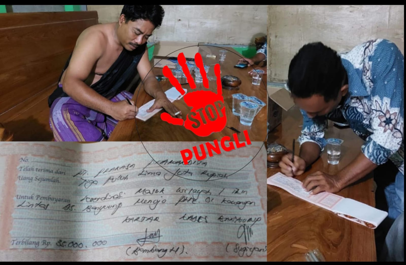 Serta bukti Kades Banyu Urip Sugianto dan Bambang oknum Karangtaruna saat menandatangani kuitansi penerimaan uang dugaan pungli dengan nominal hingga mencapai puluhan juta rupiah untuk setiap alat berat yang melintas.
