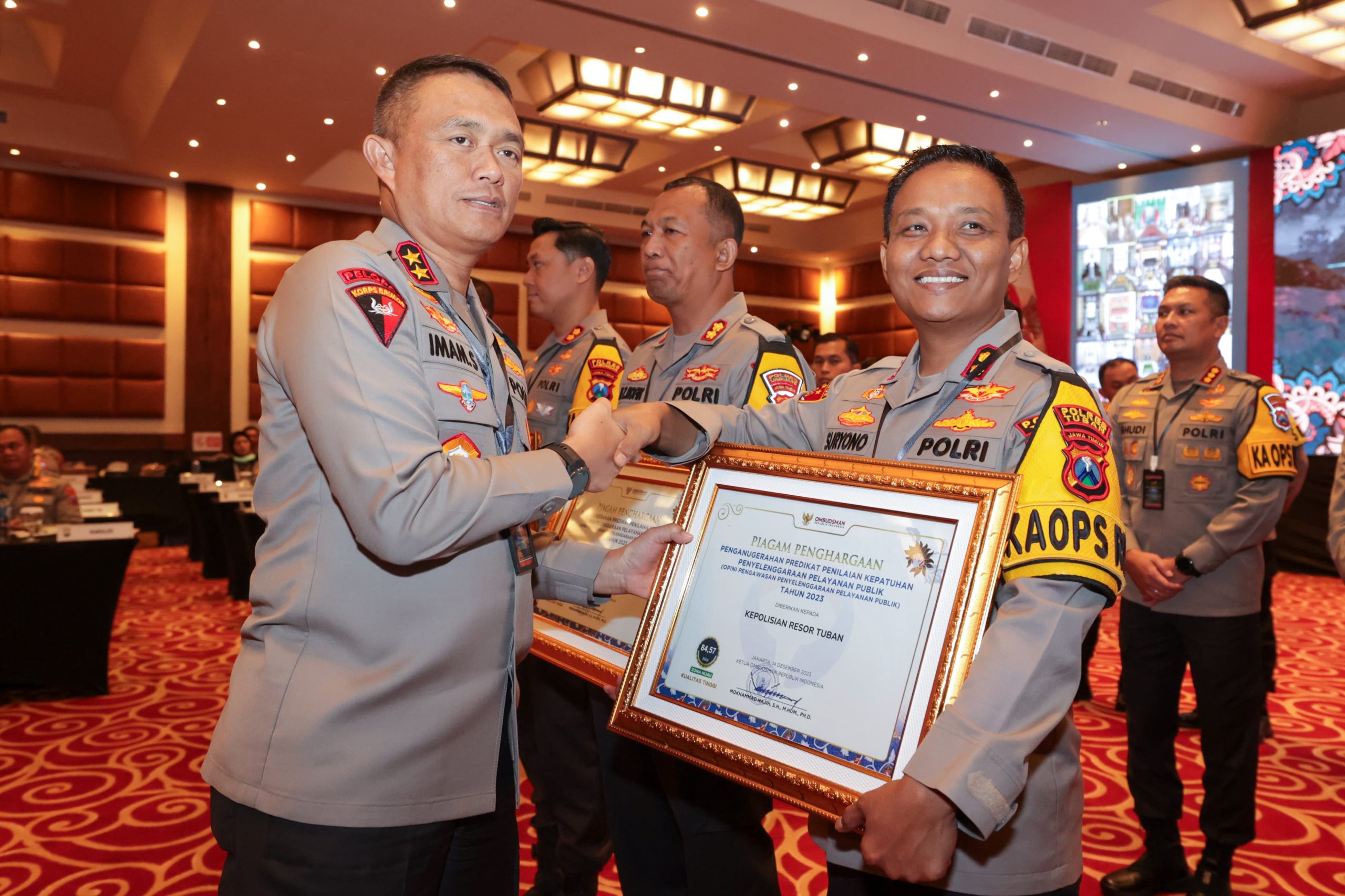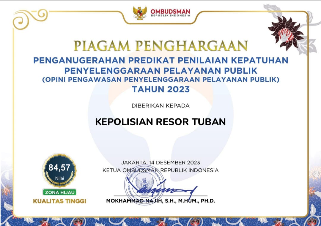 Dalam penghargaan tersebut Polres Tuban menempati peringkat 5 jajaran Polda Jawa Timur dan mendapat predikat hijau dengan nilai 84,57 kategori kualitas tinggi.
