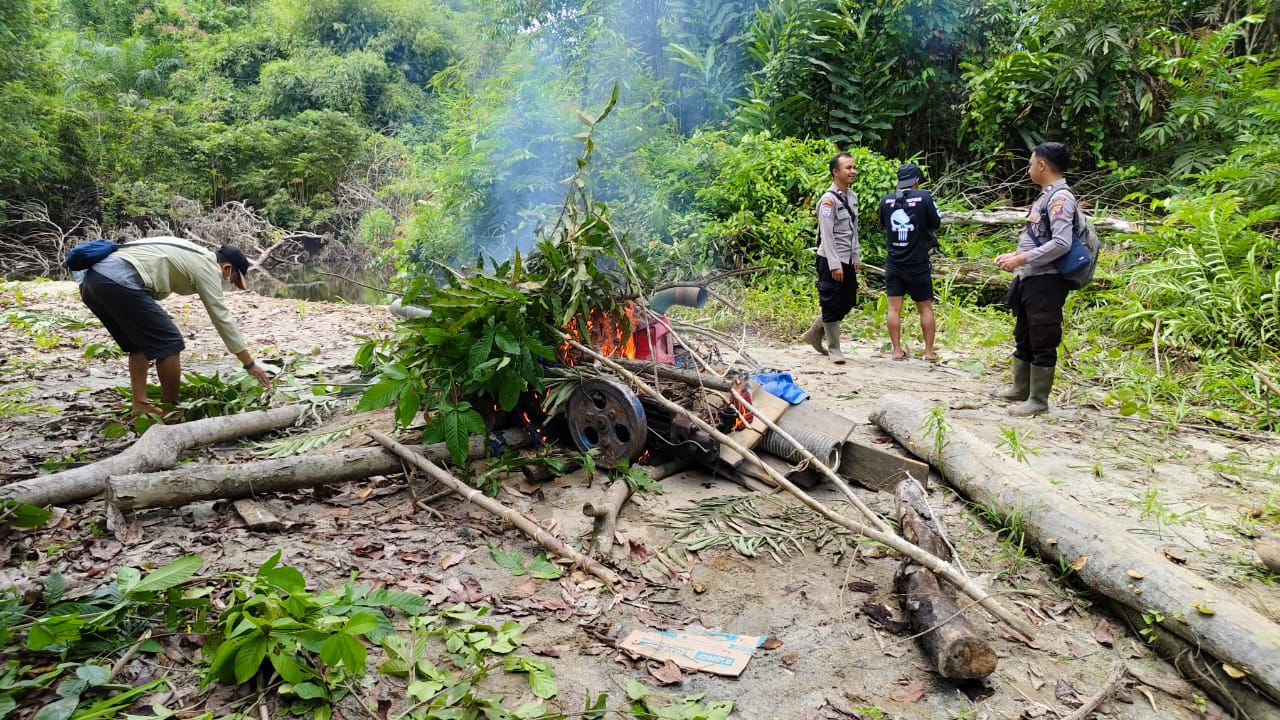 “Sekitar pukul 13.00 WIB, petugas tiba di area penambangan dan menemukan satu set mesin serta peralatan yang digunakan untuk kegiatan penambangan emas. Namun para pekerja tidak ditemukan di lokasi dan diduga telah melarikan diri sebelum kedatangan petugas,” ungkap IPDA Eric.