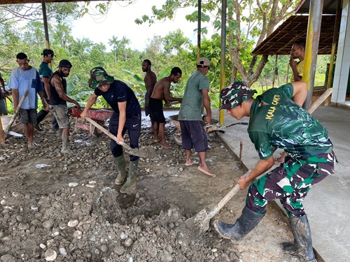 Boven Digoel – Membantu wujudkan tempat ibadah yang nyaman, personel Satgas Pamtas Yonif 126/KC Pos Niniate bersama masyarakat mengadakan gotong royong merenovasi lantai Gereja Kristus Raja Kampung Niniate, Distrik Niniate, Kab. Boven Digoel.
