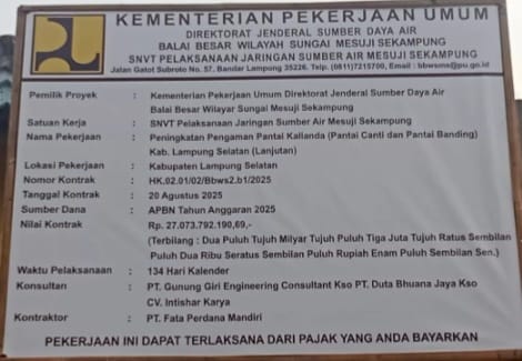 Lampung Selatan – Transpos.id, 12 oktober 2025, – peningkatan pengaman ombak di Kalianda (Pantai Canti dan Pantai Banding), Kabupaten Lampung Selatan, kembali menuai sorotan. Proyek lanjutan senilai lebih dari Rp27 miliar itu sebelumnya telah menelan anggaran hingga Rp43 miliar, namun mangkrak di tengah jalan.