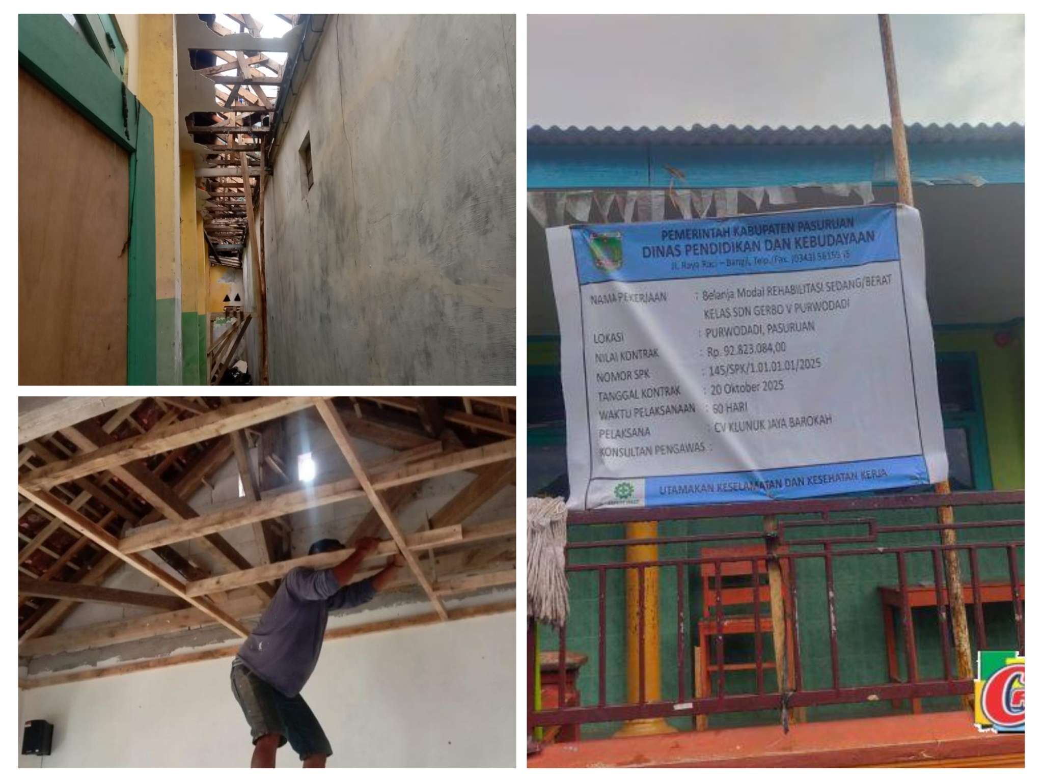 Pasuruan  – Proyek rehabilitasi ruang kelas di SDN Gerbo V, Kecamatan Purwodadi, Kabupaten Pasuruan, kini tengah menjadi perbincangan hangat dan disoal publik.