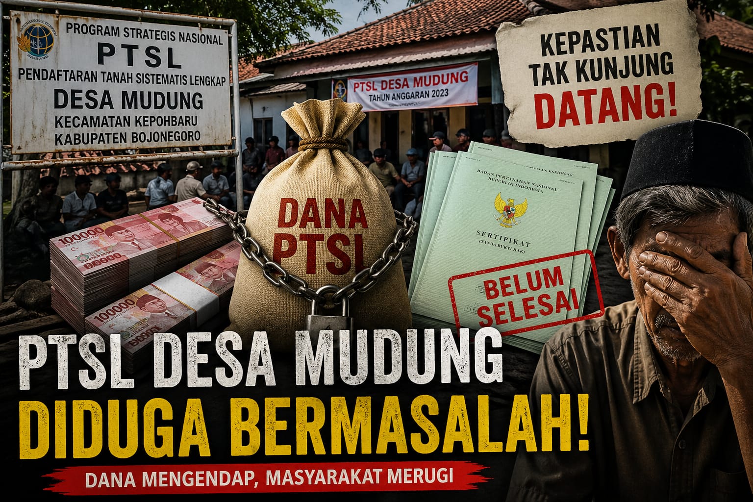 Bojonegoro – Program Pendaftaran Tanah Sistematis Lengkap (PTSL) di Desa Mudung, Kecamatan Kepohbaru, Kabupaten Bojonegoro, kini menjadi sorotan tajam. Program nasional yang sejatinya dirancang untuk memberikan kepastian hukum atas kepemilikan tanah, justru dinilai berjalan tanpa arah dan meninggalkan tanda tanya besar di tengah masyarakat.