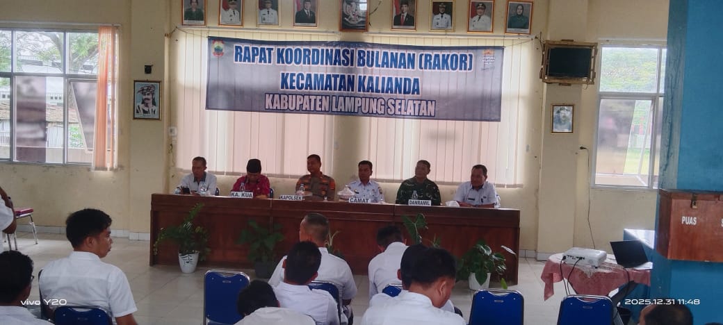 Lampung Selatan, Transpos.id. – Pemerintah Kecamatan Kalianda, Kabupaten Lampung Selatan, menggelar rapat koordinasi bulanan (rakor) pada Rabu (31/12/2025). Kegiatan tersebut dilaksanakan di aula Kantor Kecamatan Kalianda sebagai forum evaluasi kinerja serta sinkronisasi program lintas sektor menjelang pergantian tahun.