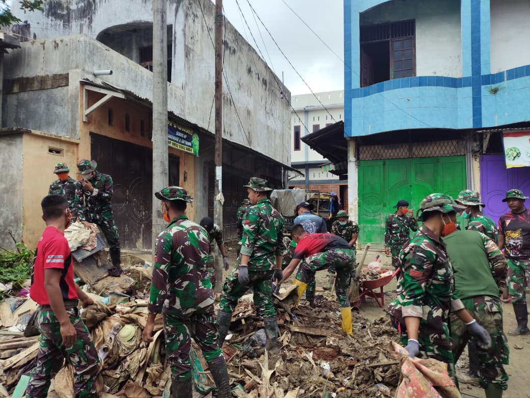 Pembersihan difokuskan pada lapak pedagang, saluran drainase, serta area umum pasar yang dipenuhi lumpur dan sisa material banjir. Dengan peralatan seadanya, para prajurit TNI bekerja secara gotong royong membersihkan lingkungan pasar agar kembali bersih, aman, dan layak digunakan.