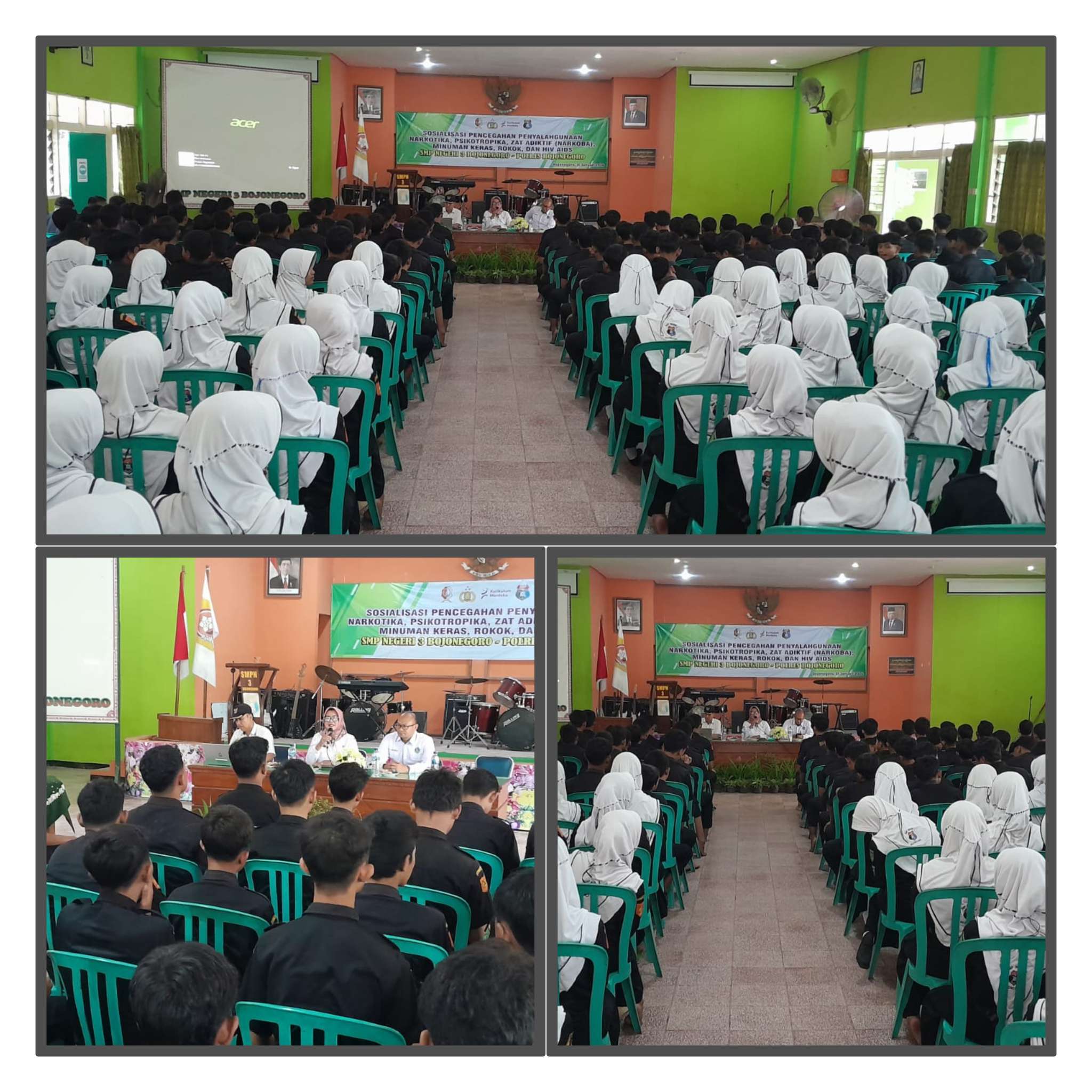 Serta Pelaksanaan kegiatan sosialisasi bahaya penyalahgunaan Narkoba kepada Siswa/Siswi SMPN 3 Bojonegoro. jumlah peserta yang mengikuti kegiatan tersebut sebanyak 250 Siswa/Siswi.