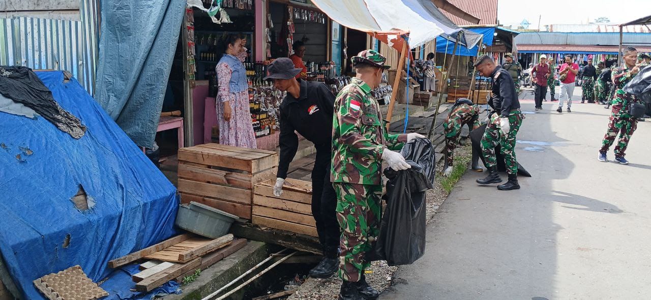 Timika, transpos.id – Dalam rangka menyambut bulan kasih Natal 2025, Kodim 1710/Mimika bersama satuan TNI-Polri dan masyarakat menggelar kegiatan karya bakti pembersihan pasar, bertempat di Kel. Pasar Sentral, Distrik Mimika Baru, Kab. Mimika, Sabtu (29/11/2025).