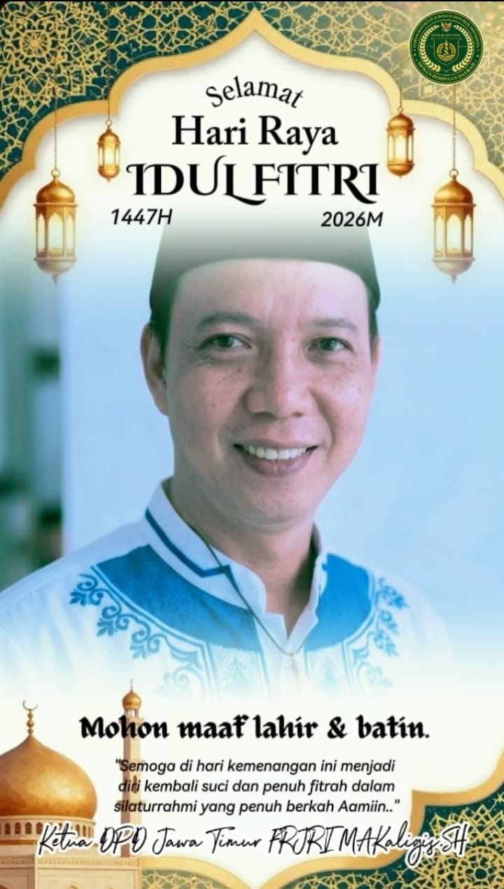 Sidoarjo – Dewan Pimpinan Daerah Jawa Timur Forum Reporter dan Jurnalis Republik Indonesia (DPD Jatim FRJRI) menyampaikan ucapan Minal aidzin wal faidzin, mohon maaf lahir dan batin kepada seluruh umat Muslim di Indonesia dalam menyambut Hari Raya Idul Fitri 1447 Hijriah.