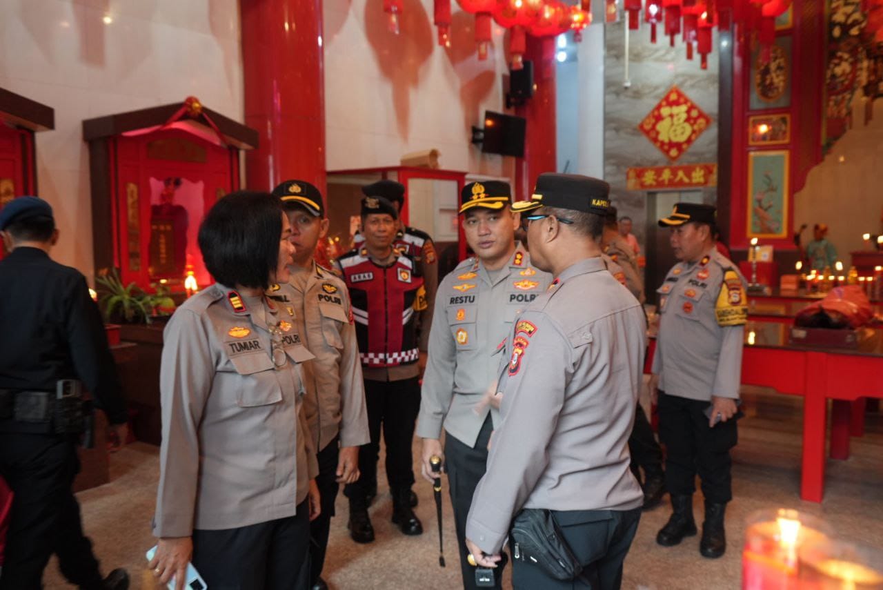 Kapolres Pelabuhan Makassar, AKBP Restu Wijayanto, didampingi Wakapolres, pejabat utama (PJU), dan Kapolsek Wajo, turun langsung ke lapangan untuk mengecek kesiapan pengamanan di klenteng dan vihara.